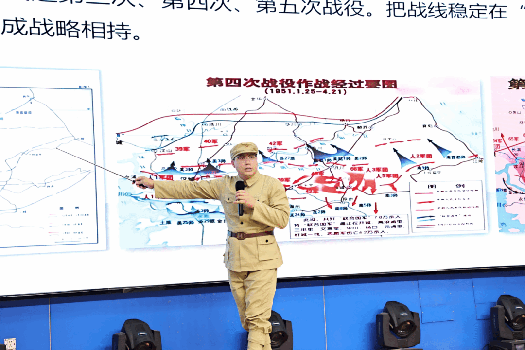 主题宣讲不仅限于理论讲述,还融入了丰富的沉浸式体验。思政课教师、大学生、小学生三人与中国人民志愿军战士“跨时空对话”,情感真挚,令人动容;主讲人身穿中国人民志愿军服装,全面讲解抗美援朝战争“五次战役”,跌宕起伏,激荡人心;现场通过“弹幕”实现青少年实时参与互动讨论,表达了对英雄的崇敬和对和平的珍视。