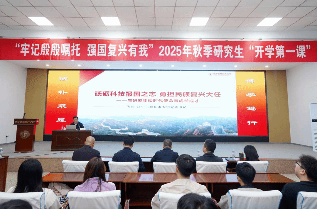 10月9日,辽宁工程技术大学研究生“开学第一课”隆重举行。校党委书记岑松以“砥砺科技报国之志 勇担民族复兴大任”为主题,为莘莘学子上了一堂深刻而富有启迪的思政课,引导广大研究生深刻把握时代脉搏,传承学校“太阳石精神”,勇担强国建设的历史重任。