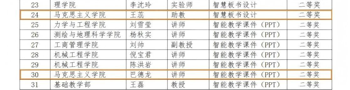 在智能教学课件(PPT)比赛中,李灵、王明雪荣获一等奖,巴德龙荣获二等奖;在融合型教学设计比赛中,于娜荣获二等奖,姜珊、齐乐、冯锐姿荣获三等奖;在智慧板书设计比赛中,王蕊荣获二等奖。