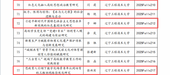其中,《用好辽宁红色资源加强高校思政工作引领研究》《数智赋能阜新大中小学思政课一体建设研究》 等一批课题,展现了我校思政课教师紧跟时代步伐,致力于将地方特色资源与现代教育技术深度融合,不断提升思政课的思想性、理论性和亲和力、针对性的积极探索。