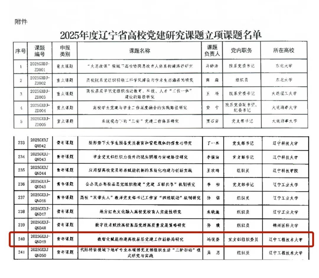 近日,辽宁省委教育工委下发了《关于公布2025年度辽宁省高校党建研究课题立项课题名单的通知》(辽委教通〔2025〕51号)。我校思政课教师冯锐姿申报的《数智化赋能构建高校基层党建工作新格局研究》获批青年课题立项。