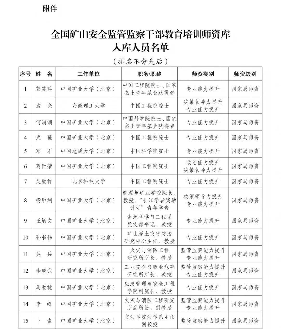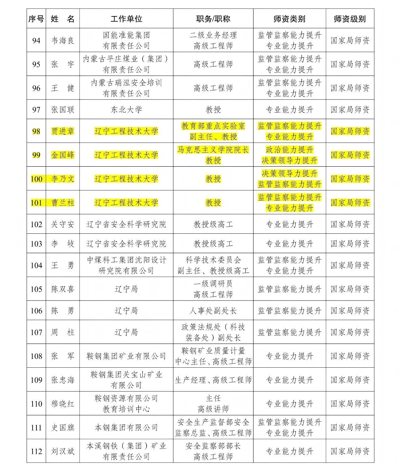 近日,国家矿山安全监察局公布了全国矿山安全监管监察干部教育培训师资库入选名单,我校安全科学与工程学院贾进章、马克思主义学院金国峰、工商管理学院李乃文、矿业学院曹兰柱4人入选国家局师资库,彰显了辽宁工程技术大学在服务国家矿山安全战略、推动跨学科融合发展方面的突出贡献。